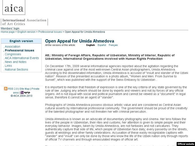 Халқаро Санъатшунослар уюшмаси ўзбекистонлик фотограф ва видеотасвирчи Умида Аҳмедова ҳимоясига чиқди ва Ўзбекистон ҳукуматига петиция йўллади. Уюшма аъзолари Умида Аҳмедованинг "ўзбек халқига туҳмат ва ҳақорат қилганлик"да айбланаëтганига нисбатан ўз норозиликларини билдирмоқдалар.