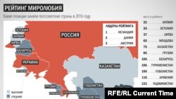Bu yilgi Global Peace Index bo‘yicha Islandiya, Daniya, Avstriya, Yangi Zelandiya va Portugaliya dunyodagi eng tinch va osoyishta mamlakatlar, deya topilgan. Ayni paytda 5 yildan buyon urush olovi so‘nmayotgan Suriya, reyting mualliflariga ko‘ra, shu kunda dunyodagi eng xavfli mamlakat bo‘lib qolmoqda.