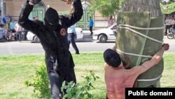 Amnesty International hisobitiga tirkalgan suratda daraxtga arqon bilan bog‘lab qo‘yilgan shaxsni chang‘ichilar niqobi bilan yuzini yashirib olgan shaxs qamchilayotganini ko‘rish mumkin. Orqa fonda esa tomoshabinlar bor.