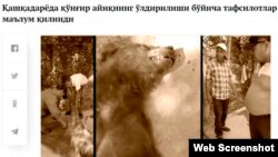 Қизил китобга киритилган қўнғир айиқнинг ўлдирилиши акс этган видеолавҳага доир янги тафсилотлар аниқланди (www.kun.uz, 28 ноябрь). Бу ҳақда Экология ва атроф-муҳитни муҳофаза қилиш идораси маълум қилди. Қайд этилишича, мазкур ҳолат 2016 йил май ойида Қашқадарё вилояти Чироқчи тумани Бешчашма қишлоғида содир бўлган. Фермер хўжалигида ишчилар ишлаётган вақтда номаълум айиқ келиб бир фуқарога ҳамла қилган. Ўша пайтда айиқ Т.С. ва Т.И. исмли шахслар томонидан кетмон билан уриб ўлдирган.