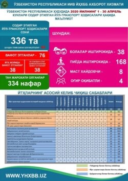 Хабарда айтилишича, бир ой ичида жами 336та йўл-транспорт ҳодисаси юз берган. Ходисада 38 киши воқеа жойида, 38 киши эса касалхонада жон берган. Бундан ташқари 334 нафар киши тан жароҳати олган.