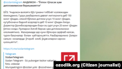 БЎЗ. “Андижон вилояти Бўз тиббиёт коллежидан ёзмоқдамиз. Куни кеча “Сиздан Телеграм”га йиғди-йиғдилар ва диплом олишдаги қийинчилик ҳақида мактуб йўллаган эди. Мактубимиз чиққач, ҳокимиятдан келиб, талабаларни “диплом ололмайсанлар” деб қўрқитишди ва “устозларимиз биздан ҳеч қандай пул олмади” деган мазмунда тушунтириш хати ёздириб олишди. Кейин 10 минг сўмдан пул тўлаб, дипломимизни олдик. Йўлкирани ҳисобга олмаганда, диплом бизга 200 минг сўмга тушди...”