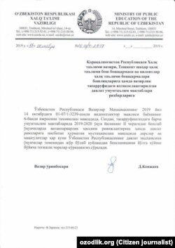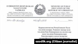 ЎЗБЕКИСТОН. “Ўзбекистон халқ таълими вазири ўринбосари Д.Кенжаев 17 октябрь куни барча ҳудудий бошқармаларга расмий хат юборди. Ушбу хатга кўра, эндиликда мактабларда дарслар давлат мадҳияси ўқувчилар томонидан жўр бўлиб куйланишидан бошланади. Ушбу тартиб ўқувчиларда ватанпарварлик ҳиссини ошириш мақсадида жорий этилди”.