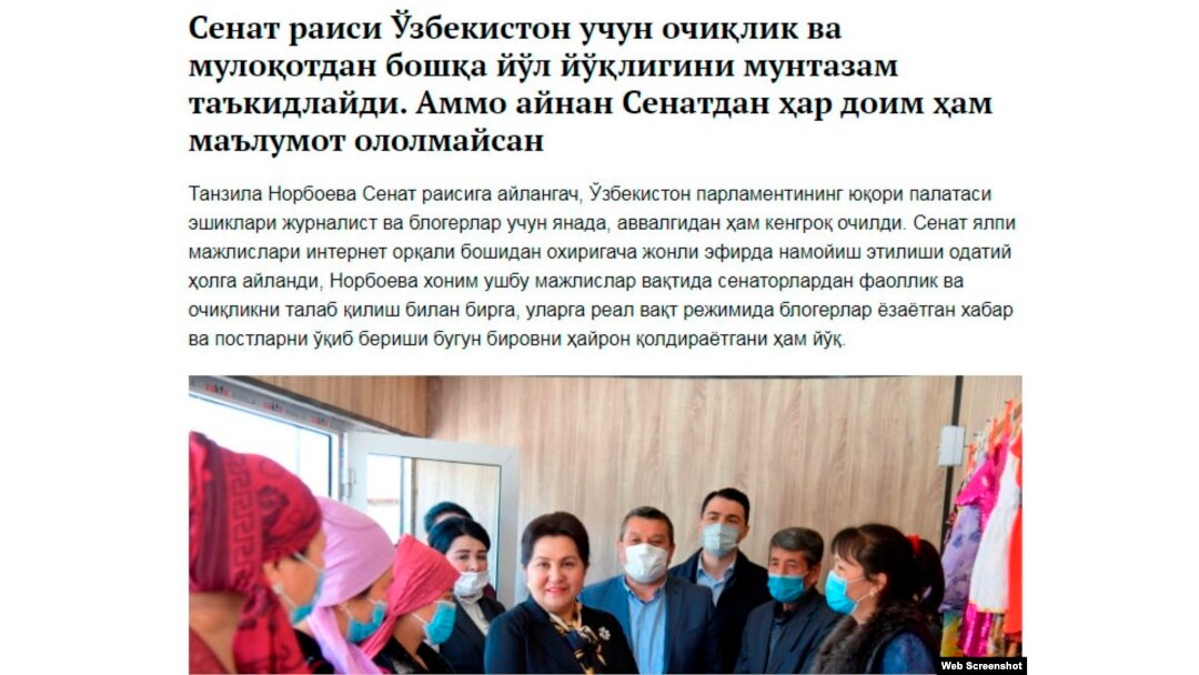 Олий Мажлис Сенати раиси Танзила Норбоева Ўзбекистон учун очиқлик ва мулоқотдан бошқа йўл йўқлигини мунтазам таъкидласа-да, айнан Сенат матбуот хизматидан ҳар доим ҳам маълумот олиб бўлмаяпти (www.daryo.uz, 14 апрель)